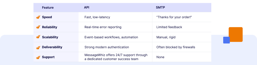 SMTP often struggles with firewalls, outdated authentication methods, and spam filters. APIs are built with modern authentication standards, helping keep emails out of spam folders,  and are better aligned with evolving security protections.