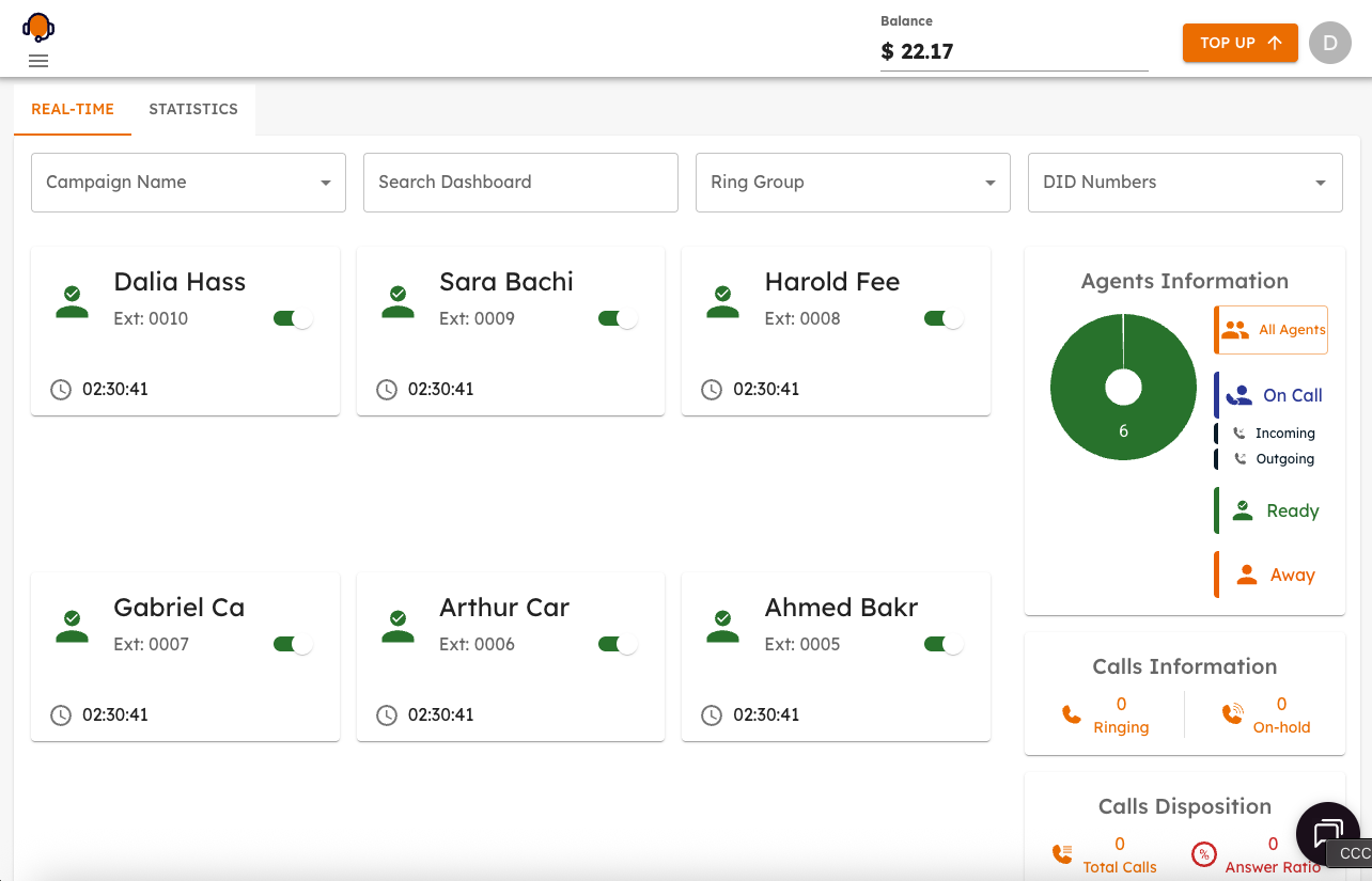 • Real-time monitoring and analytics: Provides visibility into call activity, agent performance, and customer interactions for better decision-making and quality control.