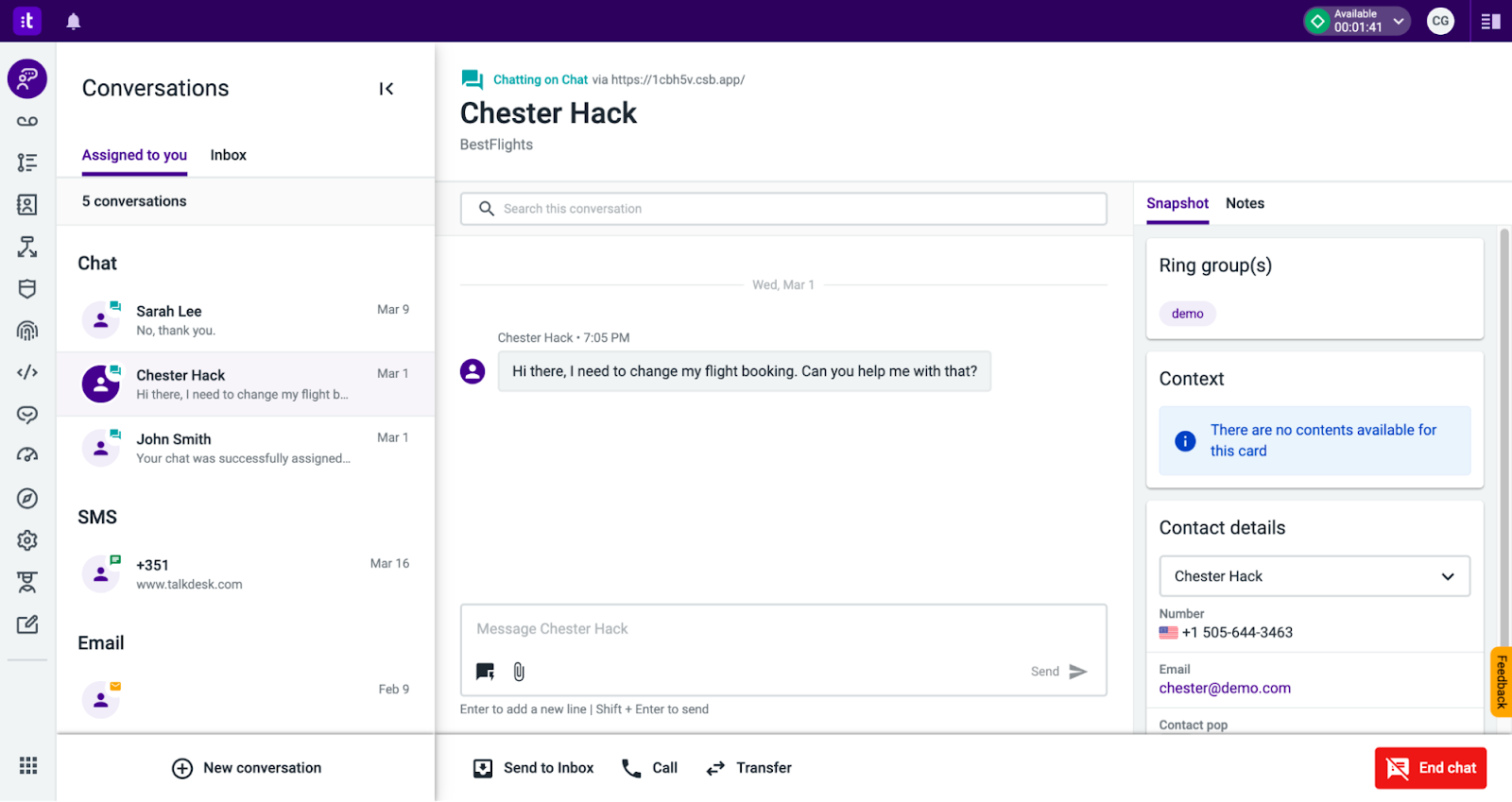• Unified customer context: Surfaces customer data and interaction history across voice and messaging channels, enabling agents to handle conversations with full context and reduce resolution times.