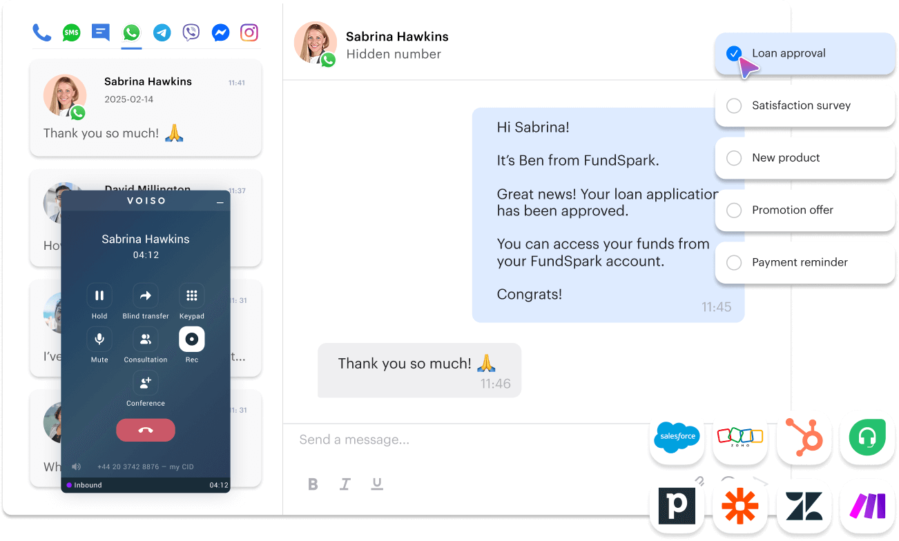• Omnichannel engagement: Consolidates voice, SMS, chat, and messaging apps into a single platform, allowing agents to manage all customer interactions through one interface.