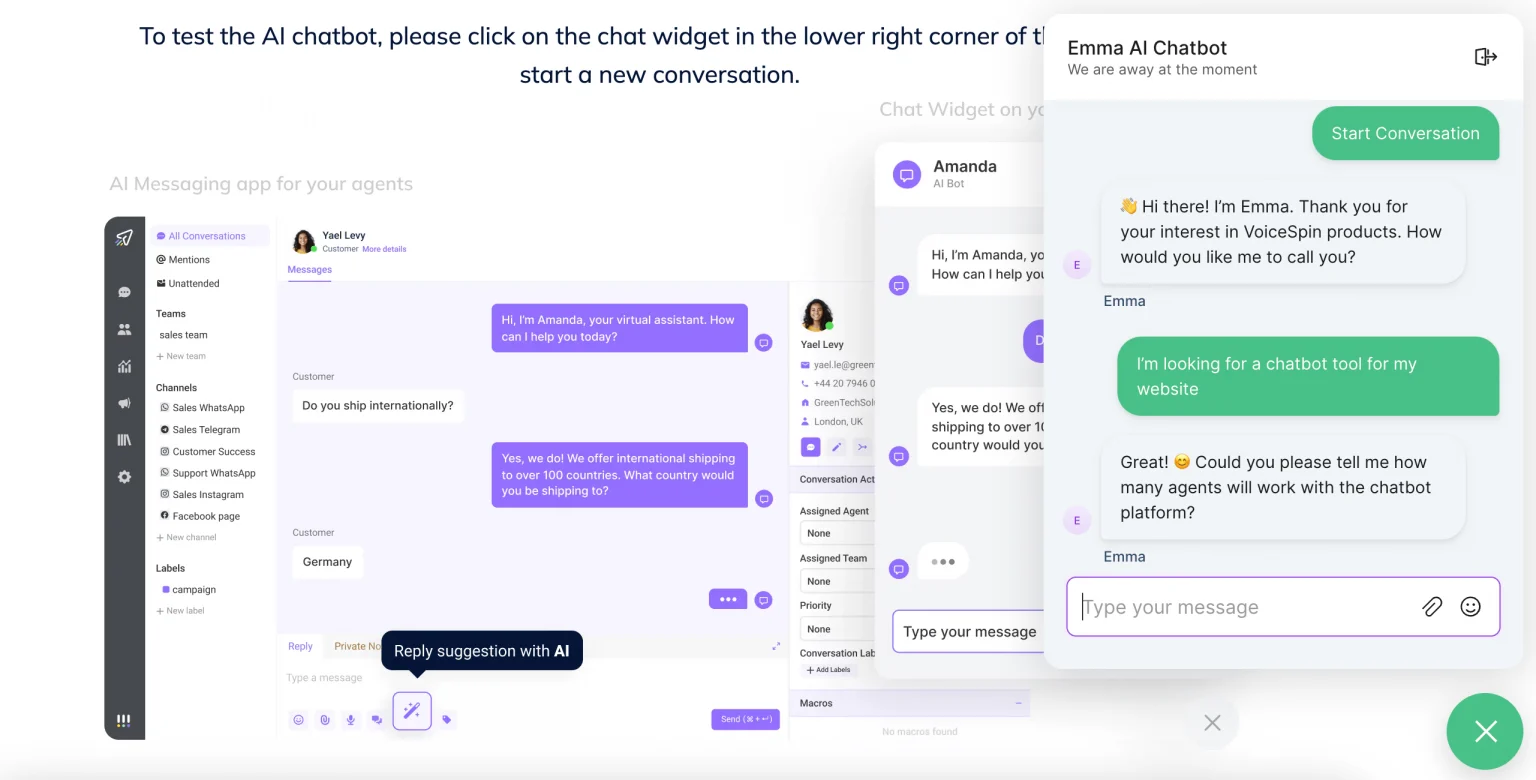 • Broad channel support: Handles WhatsApp, Facebook Messenger, Google’s Business Messages, SMS, web chat, phone, and email so teams can engage customers on preferred communication methods.