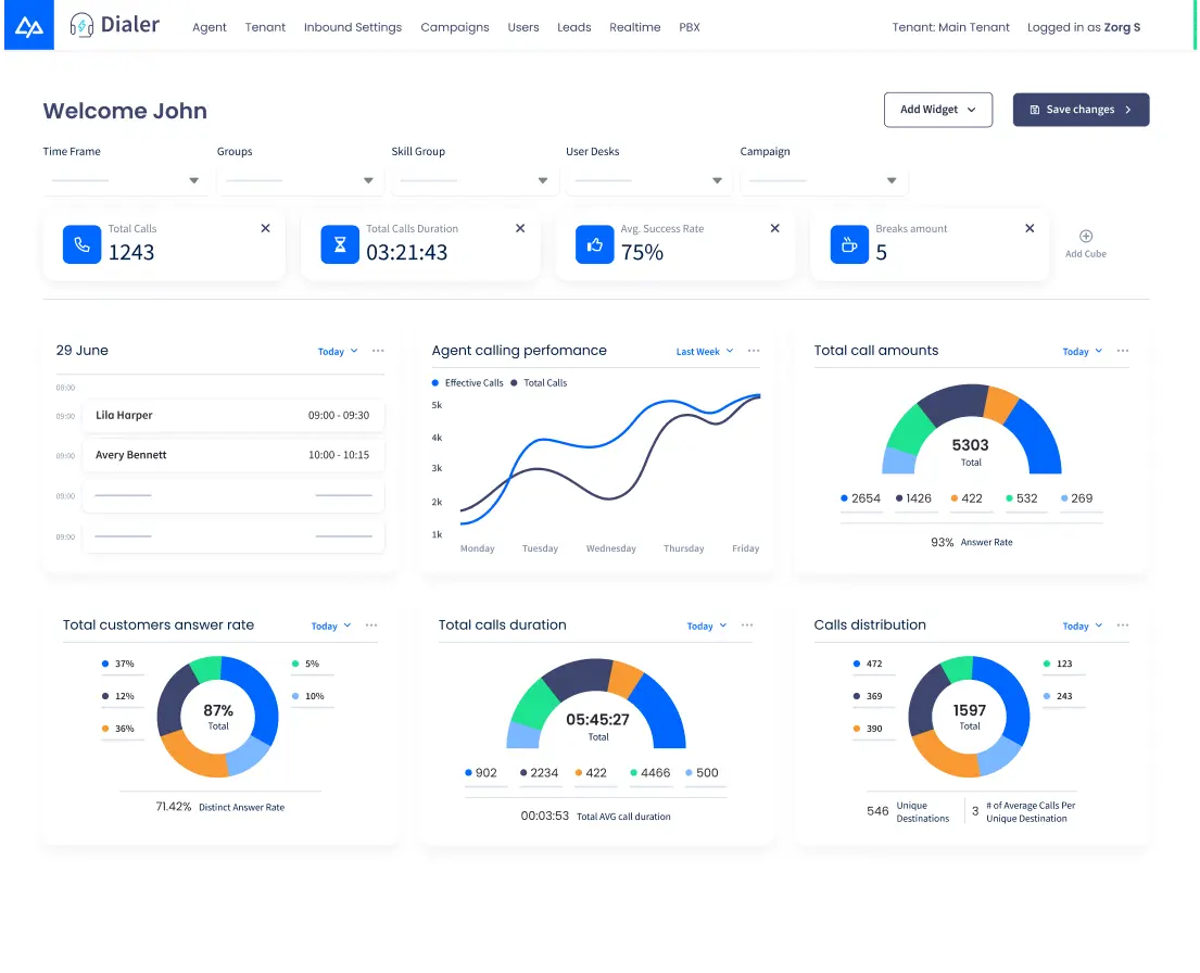 • Real-time monitoring and analytics: Provides dashboards and insights into agent performance, call outcomes, and operational metrics to support data-driven decision-making.