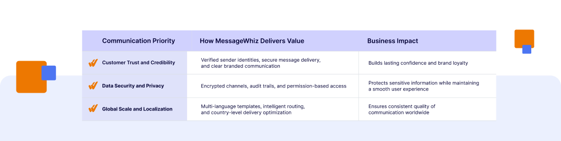 Every message sent through MessageWhiz reinforces trust and customer satisfaction. From a first-time deposit confirmation to a high-stakes transaction alert, our platform ensures that communication remains secure, consistent, and aligned with business goals.